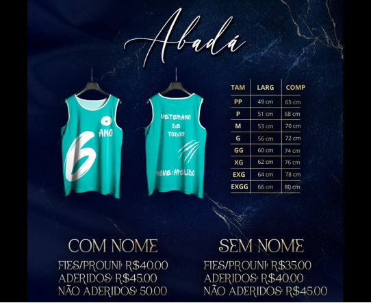 Abadá 6º Ano na cor Azul Claro, tecido Dry Fit, com personalização de "6º Ano" na parte da frente e "Veterano de Todos" na parte de trás. Personalização com nome/apelido = opcional (VALOR ADICIONAL: R$5,00).